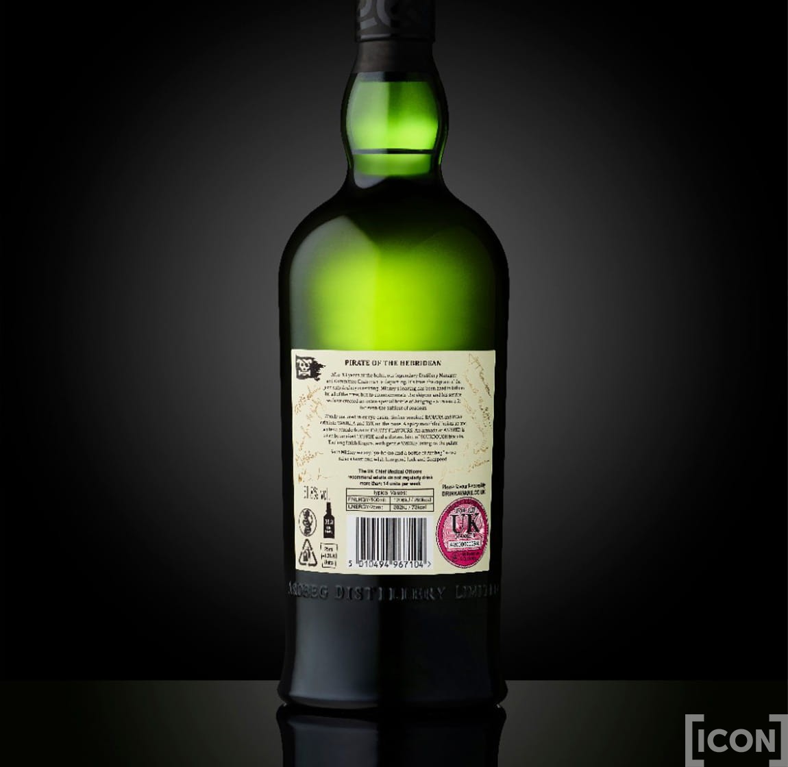 Butelka Ardbeg Arrrrrrrdbeg! Single Malt Whisky 0,7L wyróżnia się wyjątkowym designem, nawiązującym do pirackich motywów. Etykieta przedstawia stylizowany wizerunek Mickey'ego Heads'a jako pirata, co podkreśla okolicznościowy charakter tej edycji. Oczywiście, unikalny wygląd to nie jedyny atut tej edycji: