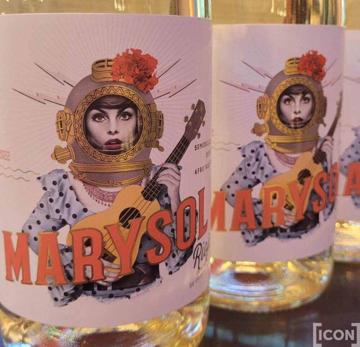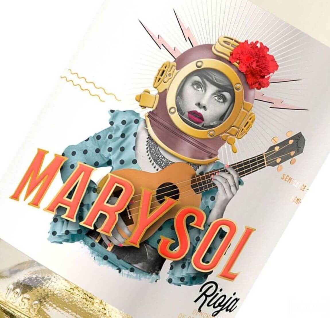 Wino Marysol Rioja zamknięto w tradycyjnej butelce z jasnego szkła, która doskonale eksponuje jego słomkowo-złoty kolor z zielonymi refleksami. Etykieta tego wina natomiast została utrzymana w abstrakcyjnym stylu, ukazując na froncie kobietę w hełmie do nurkowania, dzierżącą w dłoniach ukulele.